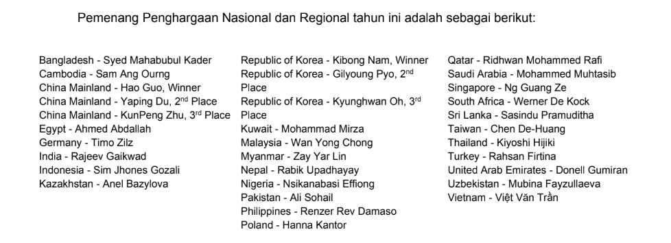 Program Penghargaan Nasional & Regional merupakan inisiatif yang dibentuk oleh Sony dan Creo di bawah naungan World Photography Organisation untuk mendukung komunitas fotografi lokal di seluruh dunia, dengan 56 negara yang turut berpartisipasi tahun ini.