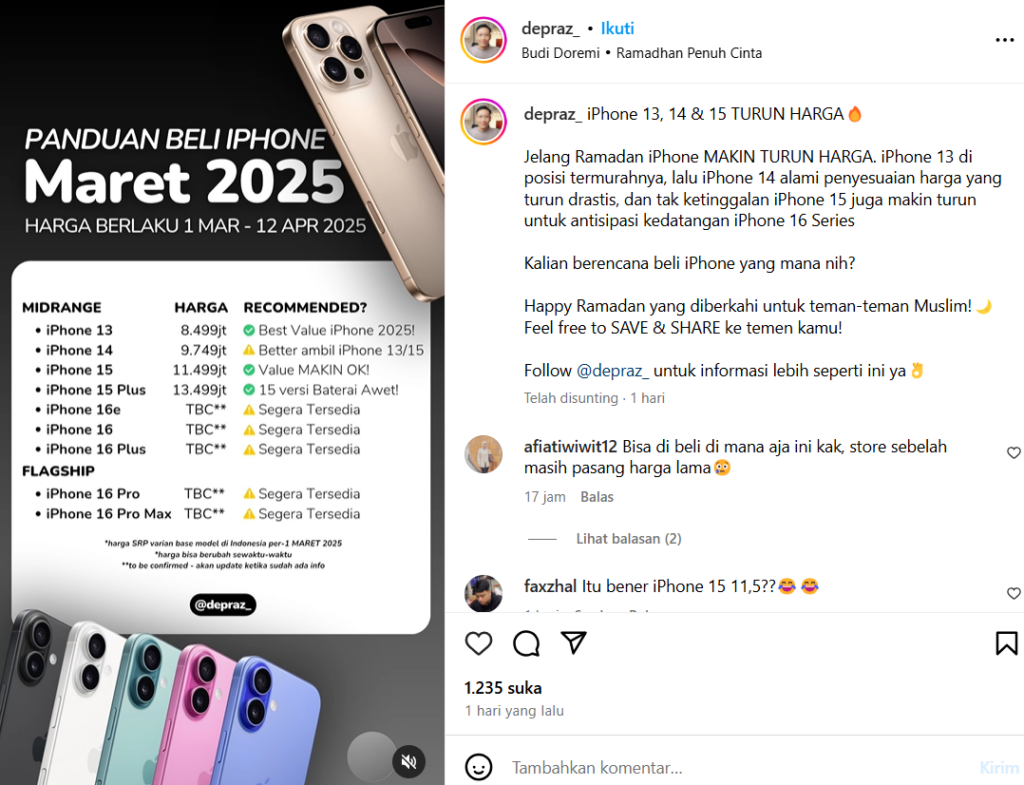 Berdasarkan pantauan nativzen.com melalui akun Instagram @depraz_, tertulis jelas bahwa iPhone 15 akan turun harga. iPhone 15 yang direkomendasikan sebagai “Value Makin OK”, kini harganya menjadi Rp 11.499.000, dan iPhone 15 Plus sekarang dibanderol Rp 13.499.000.