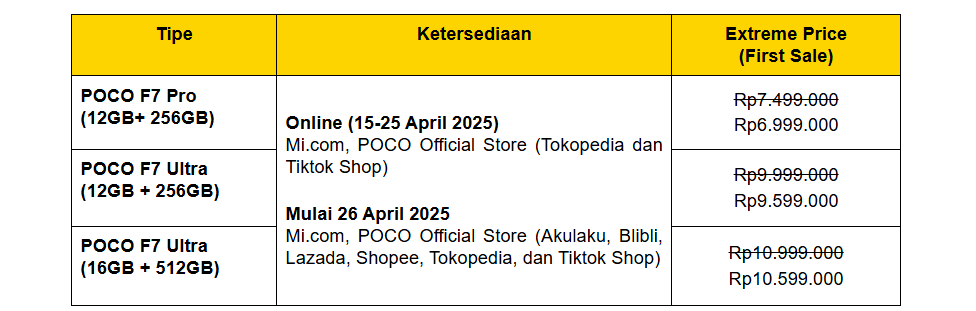 Mulai 15 April 2025 pukul 12.00 WIB hingga 25 April 2025, POCO F7 Series sudah bisa dipesan oleh para penggemar gadget di Indonesia melalui Mi.com dan di POCO Official Store ekslusif hanya di Tokopedia dan TikTok Shop.