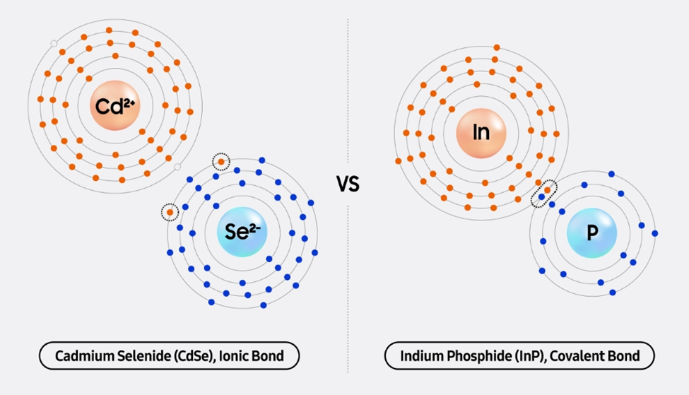 Alasan inilah, penggunaan kadmium dalam sintesis quantum dot dianggap sebagai standar akademik selama bertahun-tahun. Sebaliknya, indium (In) — alternatif kadmium dengan tiga elektron valensi membentuk ikatan kovalen dengan unsur fosfor (P), yang memiliki lima elektron valensi.