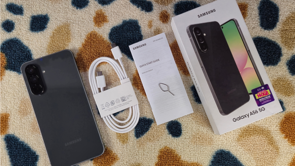 Saat bok kemasan dibuka, kamu jangan terkejut! Kamu hanya akan menemukan lembaran pemakaian singkat (Quick Start Guide) serta garansi, kabel USB-C yang berfungsi untuk mengisi daya, SIM ejector dan tentunya unit Samsung Galaxy A56 5G.