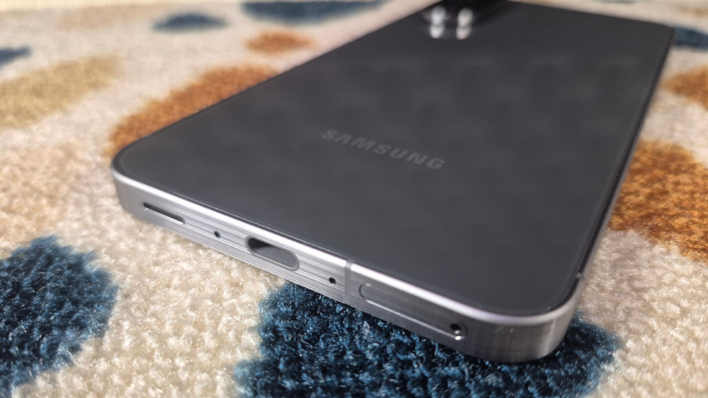 Bergeser ke sisi frame bagian atas, kamu bisa menemukan dua buah lubang mikrofon. Sementara, pada sisi frame bagian bawah, Samsung menempatkan slot untuk menampung SIM Card, lubang speaker, serta dua buah lubang mikrofon yang mengapit port USB-Type C.