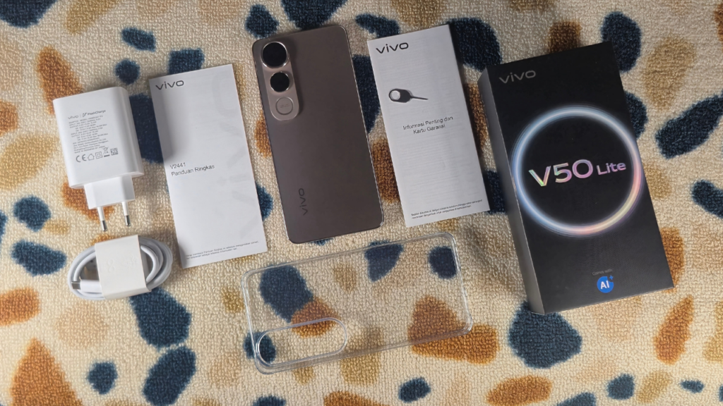 Lalu, apa saja yang ada di dalam boks kemasan tersebut? Saat kamu buka, akan langsung menemukan unit vivo V50 Lite 4G yang dibungkus plastik transparan. Di bawah unit smartphone tersebut, kamu akan menemukan beberapa aksesoris pendukung.