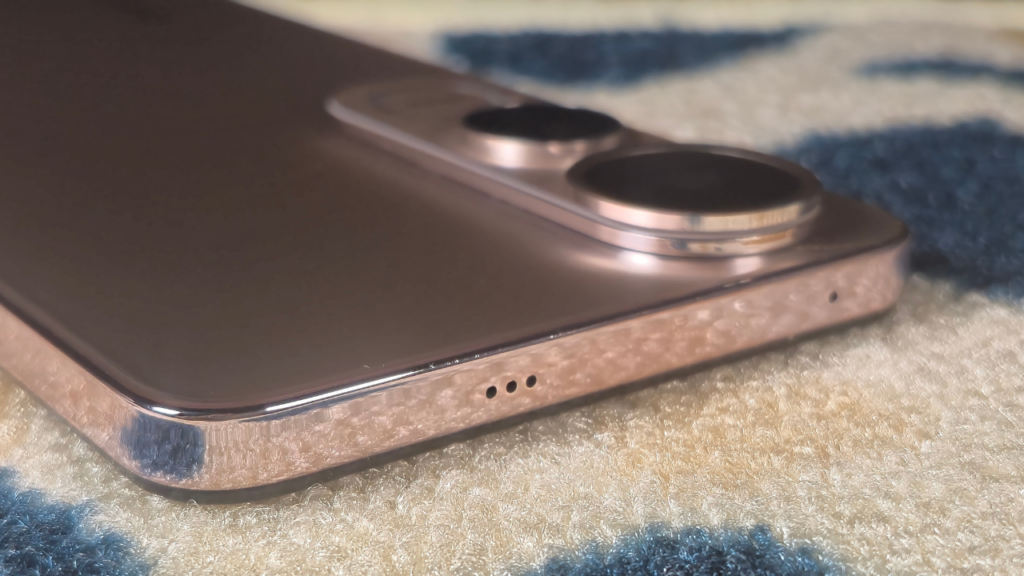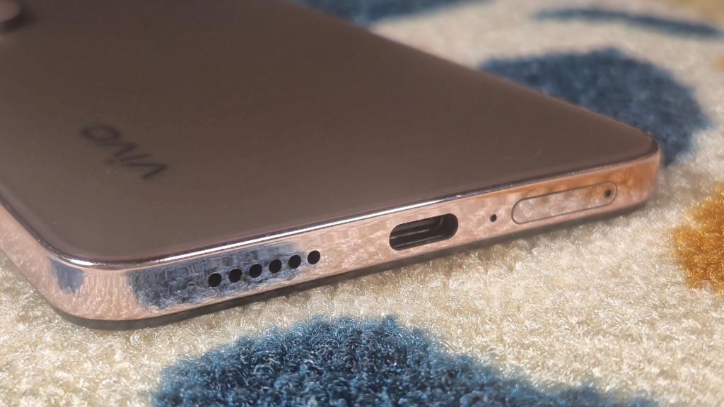 Sisi bingkai bagian atas, vivo memuat lubang speaker yang bersanding dengan lubang mikrofon. Sedangkan di sisi bagin bawah, kamu bisa menemukan slot untuk memuat dua buah SIM Card, lubang mikrofon, port USB Type-C, dan lubang speaker.