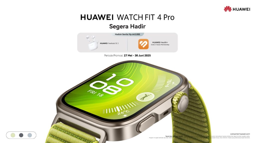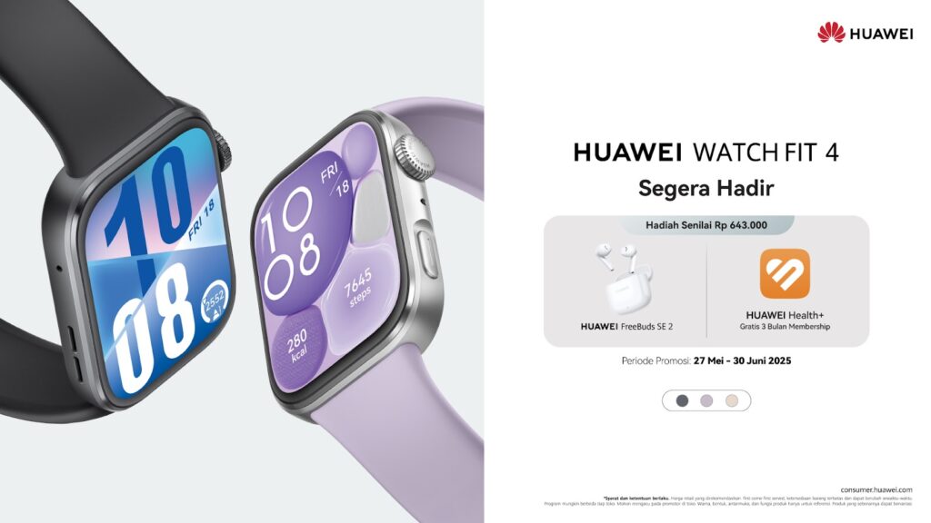 Siap memiliki HUAWEI WATCH FIT 4 Series? Dapatkan HUAWEI WATCH FIT 4 mulai dari 27 Mei 2025 dan dapatkan gratis HUAWEI FreeBuds SE 2 dan 3 Bulan Huawei Health+ senilai total Rp 643.000.