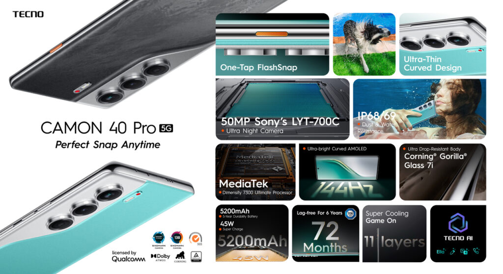 Terkait dengan durabilitas, TECNO CAMON 40 Pro 5G hadir dengan sertifikasi IP68 & IP69, menjadikannya tahan terhadap debu, cipratan air, bahkan mampu bertahan di dalam air hingga kedalaman 1.5 meter, serta tahan terhadap suhu dan tekanan tinggi.