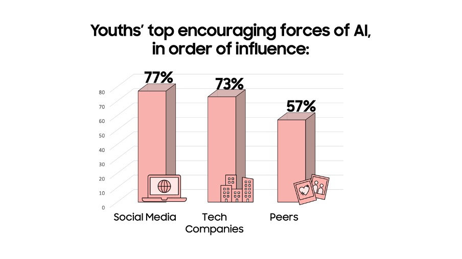 Ketika ditanya tentang apa yang memengaruhi penggunaan dan perspektif anak muda di Asia Tenggara terhadap AI, media sosial menjadi faktor teratas, dengan 77% responden menyebutkan platform tersebut sebagai kekuatan pendorong utama.