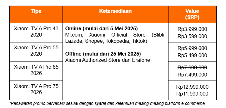 TV ini tersedia secara offline mulai 25 Mei 2025 di Xiaomi Self-operated Store, Xiaomi Authorized Store, Eradone, dan reseller resmi Xiaomi di seluruh Indonesia. Nikmati value paling spesial mulai dari Rp 3.599.000.