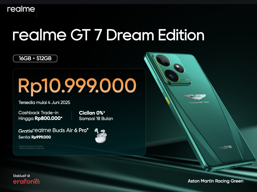 Nah, bagi konsumen yang tertarik memiliki realme GT 7 Dream Edition dalam balutan warna Aston Martin Racing Green, smartphone ini hanya tersedia dalam jumlah terbatas, yakni 200 unit, dan dibanderol dengan harga Rp 10.999.000 (16GB+12GB | 512GB).