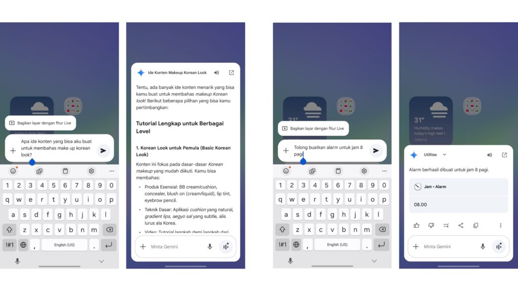 Setelah diaktifkan, kamu bisa langsung pakai Gemini untuk berbagai hal praktis: nulis caption yang catchy, cari inspirasi konten kamu, bantu bikin ringkasan catatan, buat to-do list sampai atur alarm dan reminder—cukup dengan ketik atau ajak ngomong, tanpa buka banyak aplikasi.