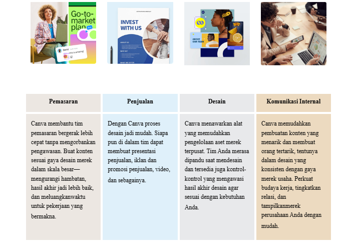 Kunci yang memungkinkan semua ini adalah Kit Kerja Canva, yakni kumpulan template, tools, dan integrasi siap pakai yang dirancang untuk melancarkan kreativitas di setiap tim. Entah itu tim pemasaran, penjualan, operasional, atau komunikasi internal.