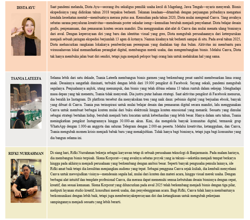 Pemilik UMKM di Tanah Air juga dapat menggunakan Canva untuk membangun merek, menceritakan kisah, dan membuka peluang baru. Kamu dapat menemui beberapa pelopor inspiratif asal Indonesia yang mengubah ide mereka menjadi nyata.