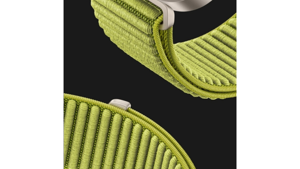 Sementara itu, strap Hijau menggunakan bahan nilon tenun 3D dengan lapisan hidrofobik, ringan, cepat kering, serta cocok untuk kegiatan seperti golf dan bersepeda, berkat desainnya yang tahan lama dan nyaman di kulit.
