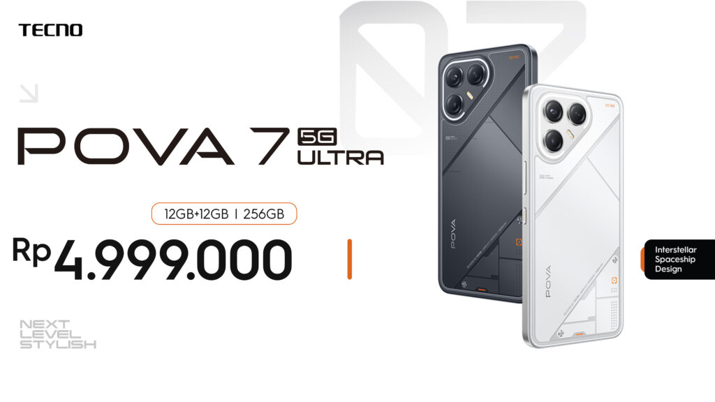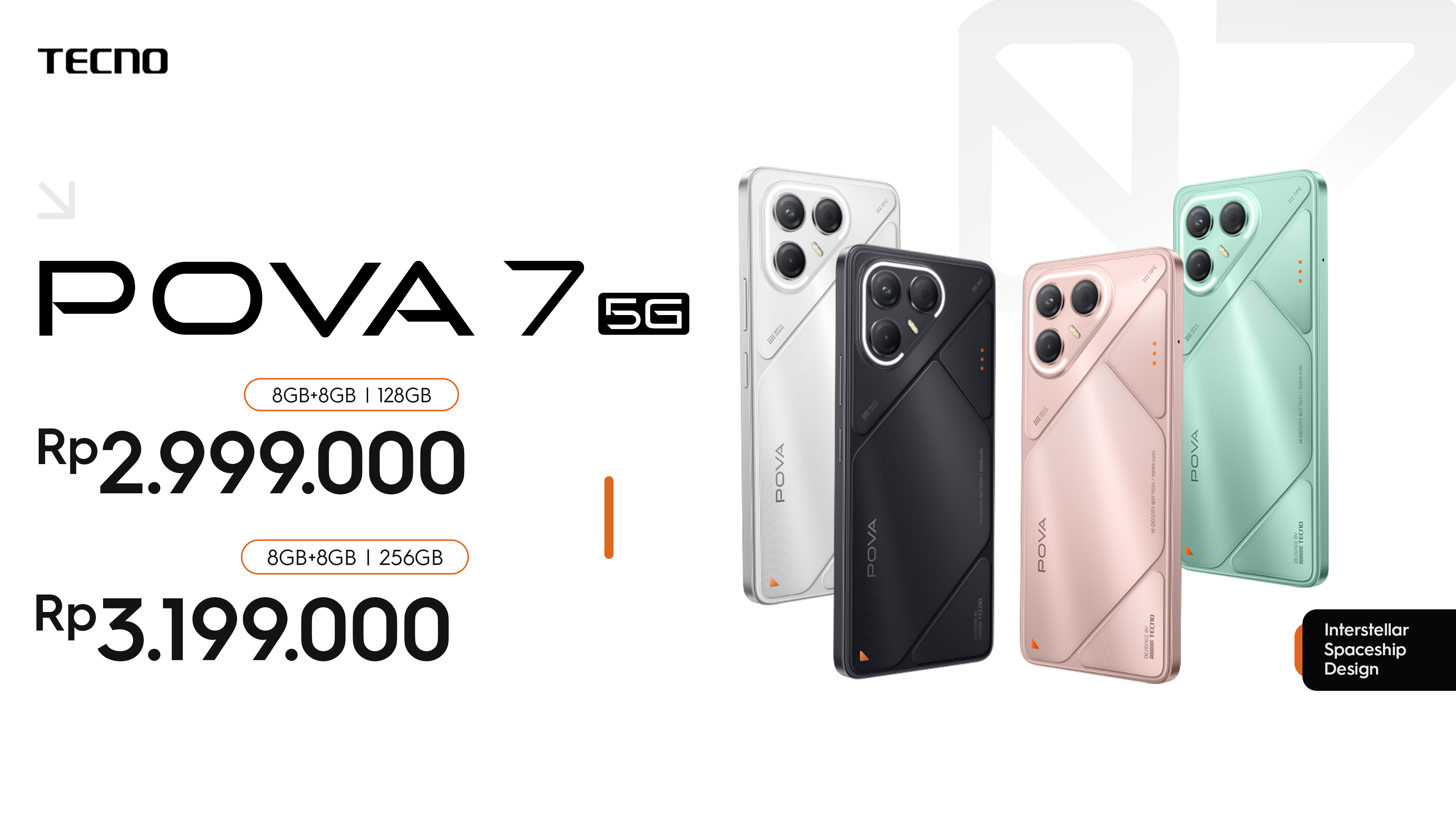 - POVA 7 Ultra 5G hadir dengan satu varian yaitu, 24GB (12+12) RAM + 256GB ROM dengan harga Rp 4.999.000, tersedia dalam dua warna, yakni Geek Black dan Geek White. Dapat dibeli di semua platform e-commerce TECNO Indonesia, seperti TikTok Shop by Tokopedia, Tokopedia, Shopee, Lazada, Blibli, dan Akulaku.