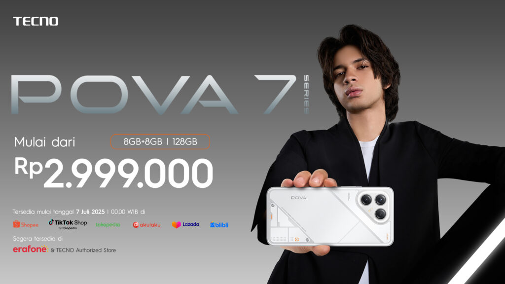 TECNO POVA 7 5G, POVA Curve 5G dan POVA Ultra 5G hadir melengkapi seri POVA 7 di Indonesia. Penjualan perdana TECNO POVA 7 series dapat dibeli di platform e-commerce pada tanggal 7 Juli 2025, 00.00 WIB.