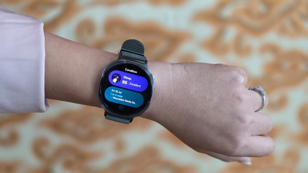 Struktur cushion yang ergonomis dan profil bodi yang lebih ramping membuatnya nyaris tak terasa saat digunakan di berbagai aktivitas. Dikatakan oleh Achmad bahwa Galaxy Watch8 Series punya desain yang cocok dengan pergelangan tangannya.