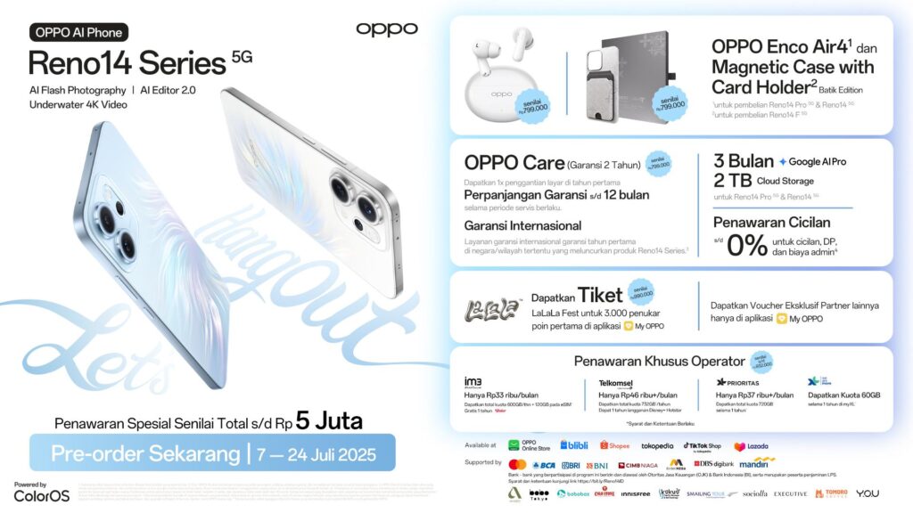 Ada juga gratis Magnetic Case & Card Holder untuk pembelian Reno14 F 5G, OPPO Care selama 2 tahun, gratis tiket Lalala Fest 2025, cashback hingga Rp 750.000 dan cicilan 0% dari bank partner, penawaran khusus dari operator pilihan, hingga berbagai voucher eksklusif dari partner yang dapat ditukarkan di aplikasi My OPPO.