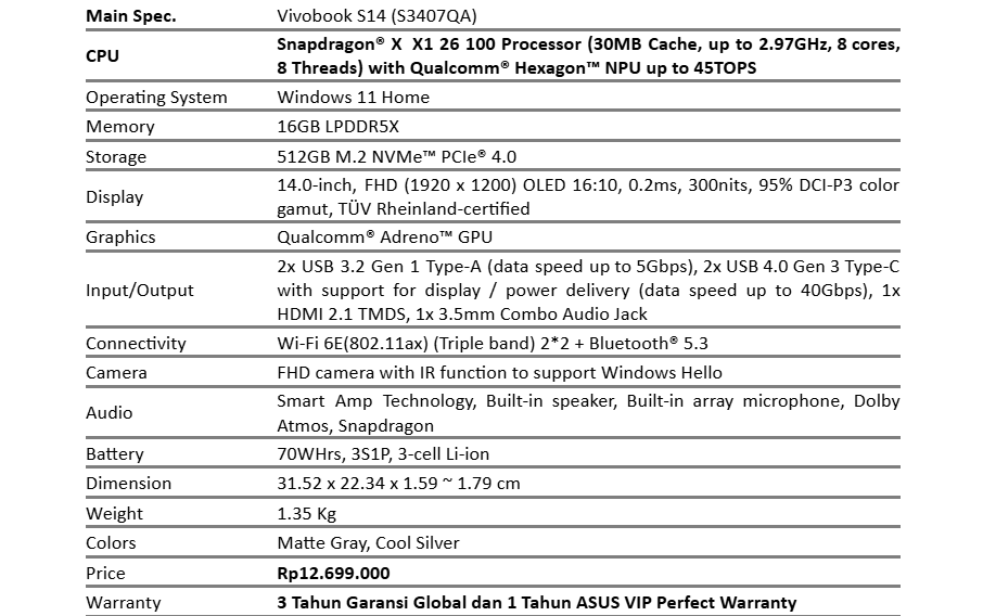 Laptop AI tipis berlayar OLED ini ditenagai prosesor Snapdragon® X Series serta Neural Processing Unit (NPU) hingga 45 TOPS. Sebelumnya, ASUS Vivobook S14 (S3407QA) sudah lebih dulu hadir untuk melengkapi lini produk laptop AI Copilot+ PC di Indonesia.