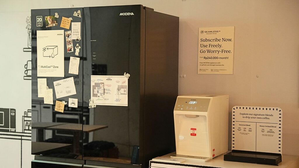 Refrigerator MODENA dengan desain sleek ditempatkan sebagai centerpiece yang tak hanya berfungsi menyimpan kesegaran, tapi juga menjadi spot tempat pengunjung bisa memajang foto-foto momen hangout mereka di Casa MODENA.