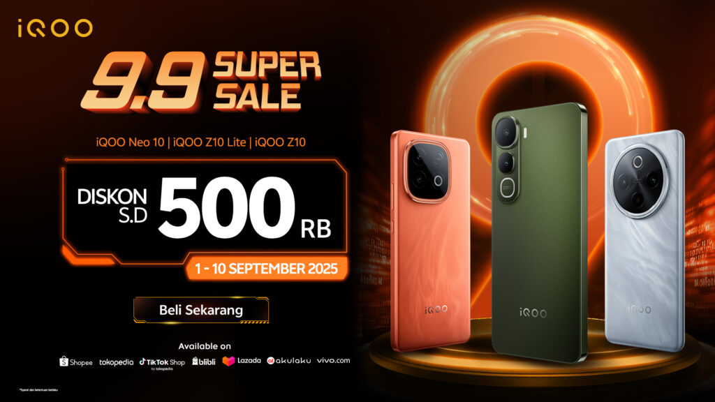 Menyambut keramaian bulan September, iQOO mengadakan iQOO 9.9 Super Sale yang memberikan nilai tambah, potongan harga, dan hadiah menarik. Promo iQOO 9.9 Super Sale dapat didapatkan melalui e-commerce online di Indonesia mulai dari Shopee, Tokopedia, TikTok, Blibli, Lazada, Akulaku, dan website resmi iQOO.com.