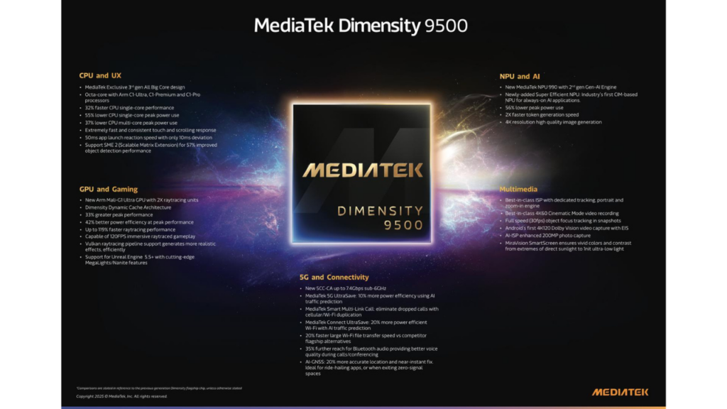 MediaTek Dimensity 9500 mengadopsi desain CPU All Big Core generasi ketiga, menggabungkan satu ultra core 4,21GHz, tiga premium core, dan empat performance core, dengan penyimpanan empat saluran UFS 4.1.