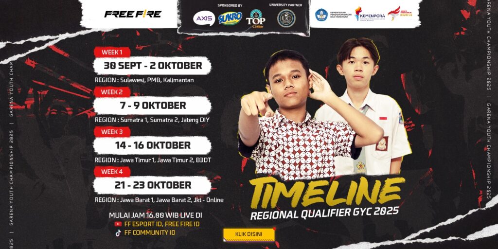 NATIVZEN.com – Setelah melalui rangkaian City Qualifiers di 82 kota dan Online Qualifiers dengan total lebih dari 15.000 tim pendaftar, Garena Youth Championship (GYC) Free Fire 2025 resmi memasuki babak Regional Stage mulai 30 September 2025.