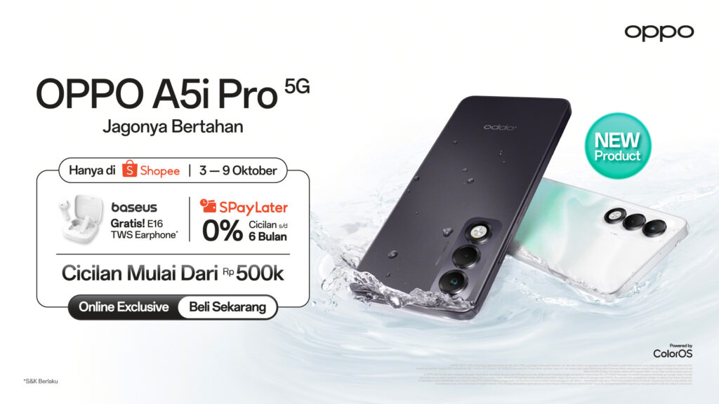 OPPO A5i Pro 5G tersedia eksklusif di Shopee selama periode promo 3 – 9 Oktober 2025 dengan harga spesial hanya Rp 2.999.000 dari harga normal Rp 3.299.000. Setiap pengguna juga akan mendapatkan keuntungan eksklusif berupa gratis Baseus E16 TWS Earphone dan cicilan 0% hingga 6 bulan melalui SPayLater.