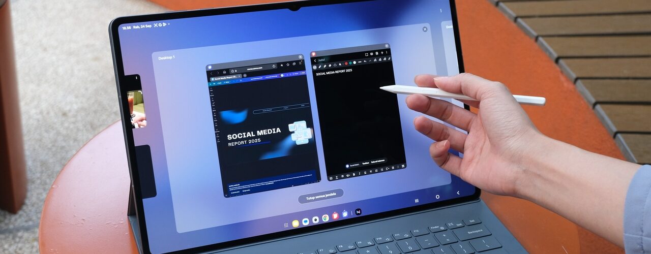 Layar luas Galaxy Tab S11 Ultra 5G sudah memberikan ruang lega untuk melakukan semuanya sekaligus. Namun, produktivitas bisa lebih dimaksimalkan dengan Samsung DeX Extended Mode yang menghadirkan pengalaman second screen sesungguhnya.