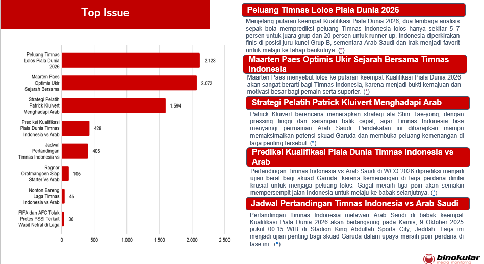 NATIVZEN.com – Menjelang laga panas antara Timnas Indonesia vs Arab Saudi di Kualifikasi Piala Dunia 2026, dunia maya Indonesia sedang bergetar. Berdasarkan riset Binokular Big Data Analytics, percakapan soal Tim Garuda mendominasi linimasa selama dua pekan terakhir — dengan nada optimisme yang semakin menguat.