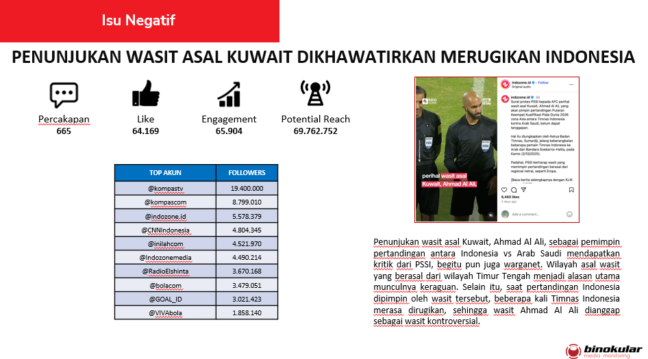 Dalam periode 24 September – 7 Oktober 2025, tercatat lebih dari 94 ribu percakapan di media sosial dan lebih dari 12 ribu artikel media yang membahas persiapan skuad Garuda. Mayoritas percakapan bernada positif (70%), memperlihatkan bagaimana publik Indonesia bersatu memberi semangat untuk Jay Idzes, Rafael Struick, dan kawan-kawan.
