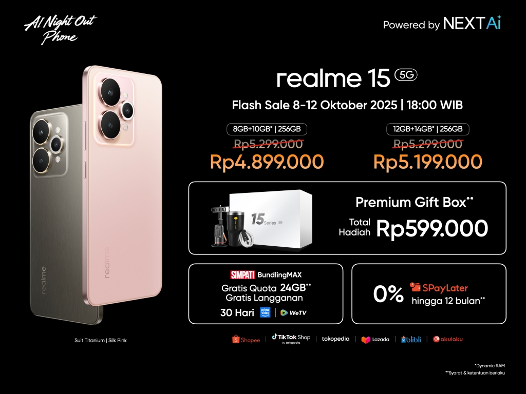 Sementara, realme 15 5G dibanderol dengan harga Rp 4.899.000 untuk varian 8GB+10GB | 256GB, dan varian 12GB+14GB | 256GB ditawarkan dengan harga Rp 5.199.000. Seluruh model yang ditawarkan bisa kamu temukan secara online dan offline.
