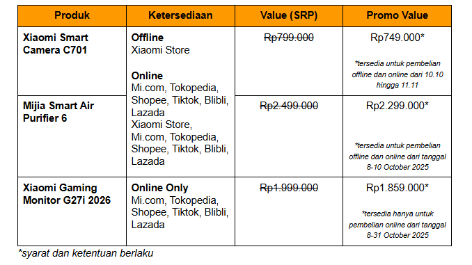 Ketiga produk terbaru Xiaomi ini akan tersedia melalui Xiaomi Store, Mi.com, serta berbagai e-commerce resmi Xiaomi Indonesia.
