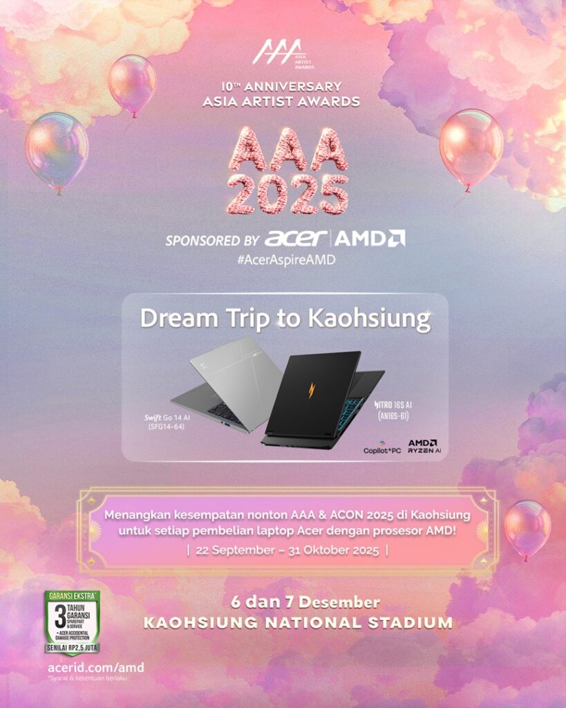 Pelanggan berkesempatan memenangkan trip ke Kaohsiung, Taiwan, dengan melakukan pembelian laptop Acer Swift, Aspire atau Nitro yang ditenagai oleh prosesor AMD, selama periode 24 September – 31 Oktober 2025, dan melakukan pendaftaran melalui www.acerid.com/amd.
