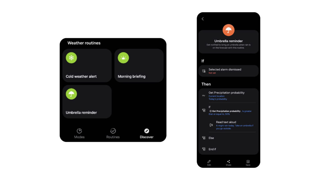 - Modes & Routines Pintar — bisa kasih notifikasi otomatis saat cuaca buruk, misalnya: “Bawa payung ya, kemungkinan hujan 80%!”