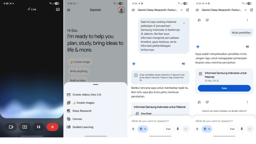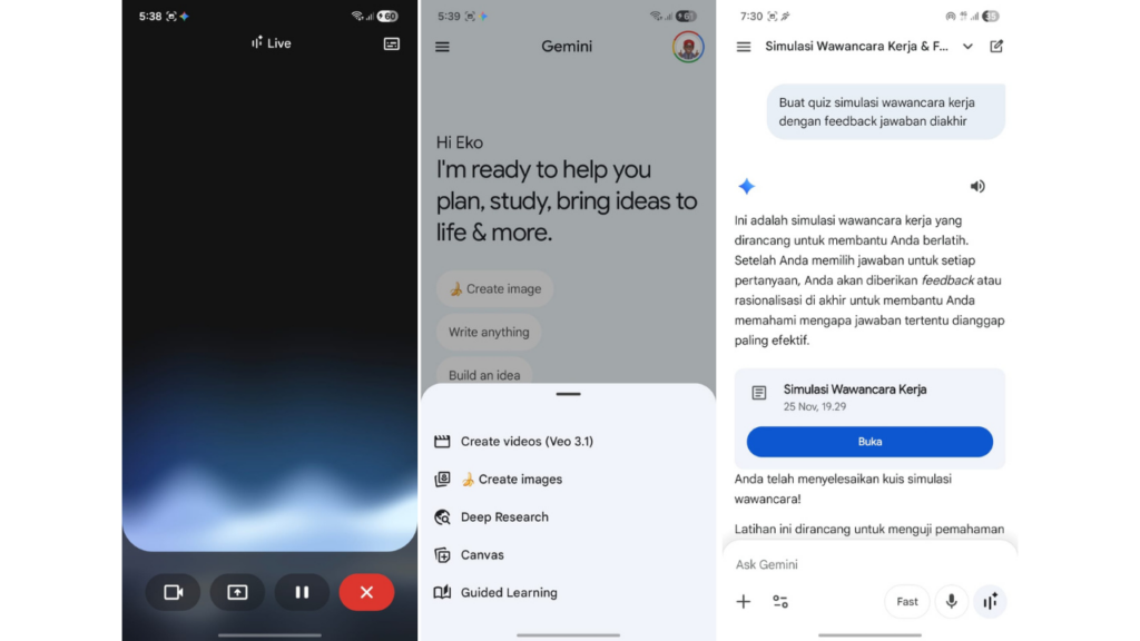 Gemini Live adalah fitur cerdas yang bisa memberikan umpan balik secara real-time. Oleh karena itu, kamu pun bisa mendapatkan koreksi langsung setelah menjawab. Dengan Gemini Live, kamu juga bisa melatih intonasi, kelancaran berbicara, dan kejelasan jawaban.