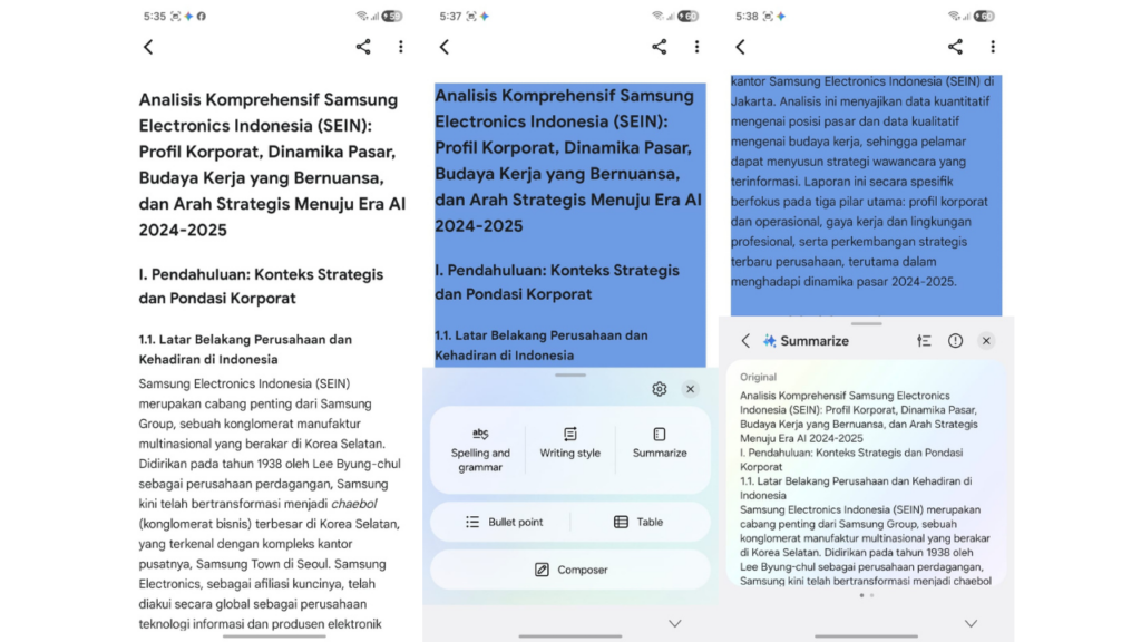 Namun, dengan bantuan Galaxy S25 FE, kamu tak perlu cemas. Kamu bisa memanfaatkan fitur Gemini Deep Research. Dengan bantuan fitur tersebut kamu bisa melakukan pencarian lebih mendalam mengenai perusahaan secara cepat dan ringkas.