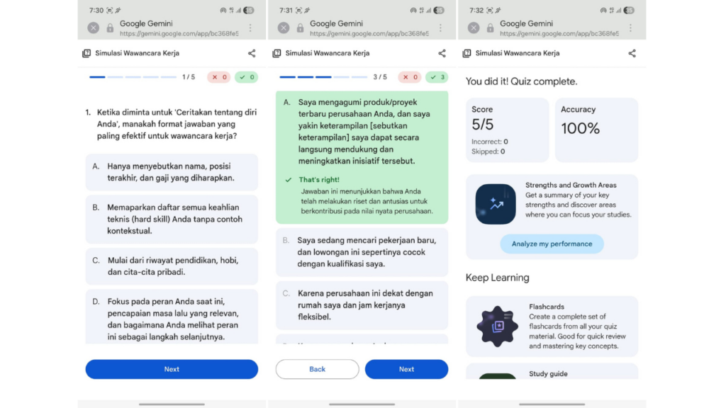 Nah, bagi kamu yang ingin latihan interview wawancara kerja, kamu juga bisa memanfaatkan Gemini Canvas. Ya, dengan bantuan Gemini Canvas, kamu bisa meminta untuk dibuatkan kuis mengenai simulasi wawancara kerja, dan di bagian akhir ada umpan balik berupa penilaiannya.