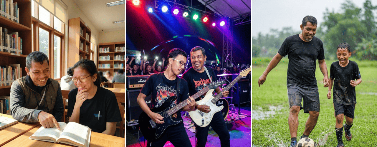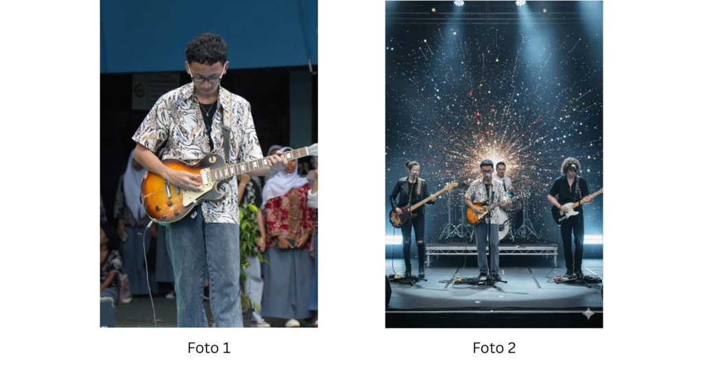 “Ubah foto anak muda yang sedang bermain gitar menjadi di atas panggung, dengan latarbelakang efek bertabur cahaya, dan tampilkan personil band lainnya.“