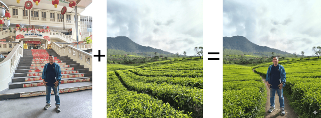 Contoh prompt: “Gabungkan aku dengan suasana hamparan kebun teh yang hijau dan langit yang cerah.” Dan lihat hasilnya!