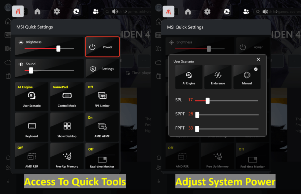 Dukungan MSI Quick Settings yang terintegrasi ke dalam Xbox Game Bar, memungkinkan pengguna untuk dengan mudah mengakses berbagai tools dan menyesuaikan pengaturan daya dengan satu klik.