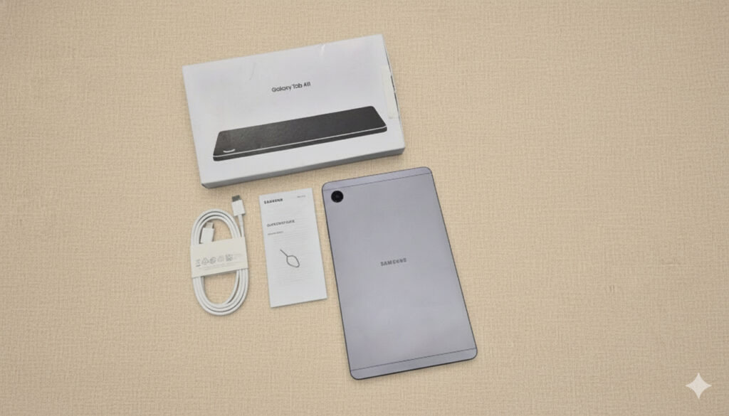 Lantas, jika boks tersebut dibuka, apa saja yang didapat oleh konsumen? Tentunya, selain unit Samsung Galaxy Tab A11, konsumen akan mendapatkan lembar Quick Start Guide dan Garansi Resmi, kabel pengisian daya USB-C to USB-C, dan ejector untuk membuka baki memory card.