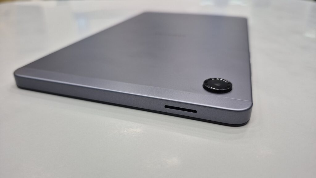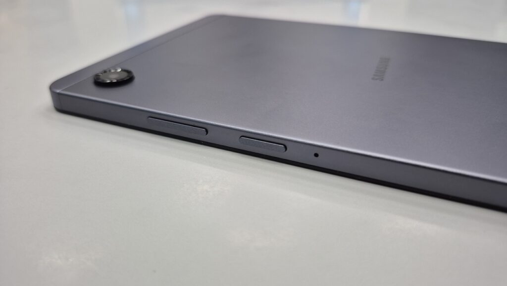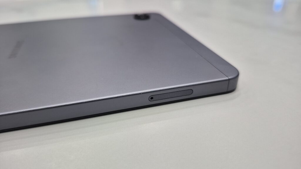 Tombol volume yang bersanding dengan tombol daya ditempatkan di sisi kanan perangkat, sementara di sisi kiri perangkat, Samsung menempatkan slot untuk menampung memory card. Ya, Galaxy Tab A11 yang ada di tangan nativzen.com ini adalah varian Wi-Fi.
