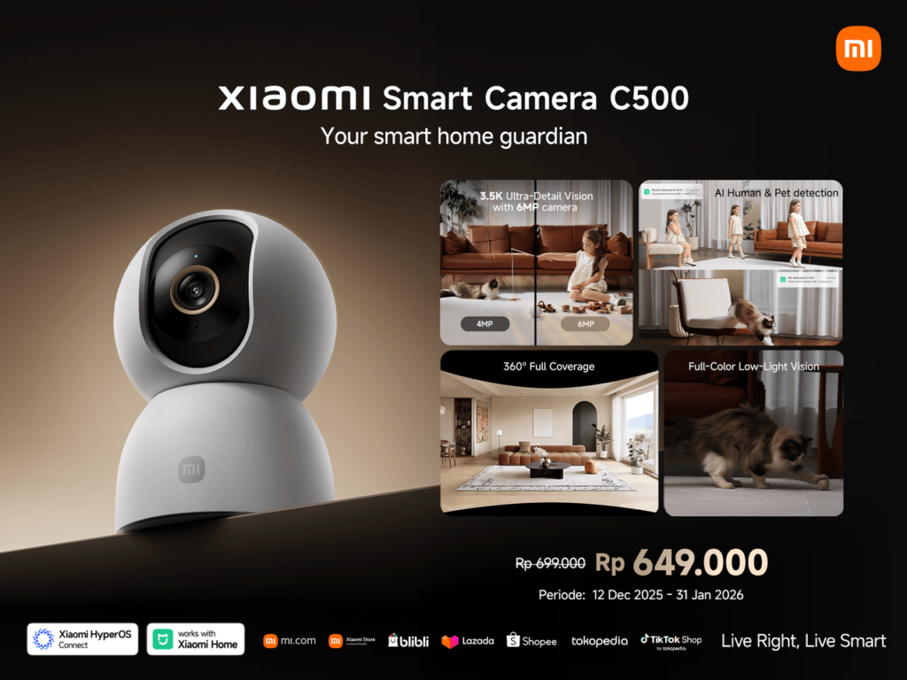 Xiaomi Smart Camera C500 hadir melalui pengumuman non-price launch pada 7 Desember 2025 dan memasuki periode First Sale pada 12 Desember 2025. Produk ini dibanderol dengan harga SRP Rp 699.000 dan tersedia dengan harga promo Rp649.000 hingga 31 Januari 2026.
