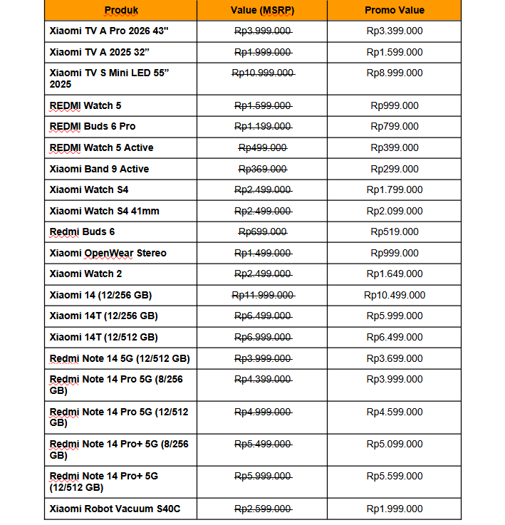 Selain model flagship tersebut, Xiaomi juga memberikan promo menarik untuk jajaran TV lainnya. Xiaomi TV A Pro 2026 43″ dibanderol dengan harga Rp 3.399.000 dan Xiaomi TV A 2025 32” bisa dibeli dengan harga spesial Rp 1.599.000.