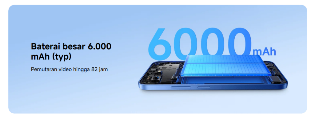 - Baterai 6.000 mAh: menawarkan daya tahan lama untuk penggunaan sepanjang hari — streaming, browsing, sampai multitasking.
