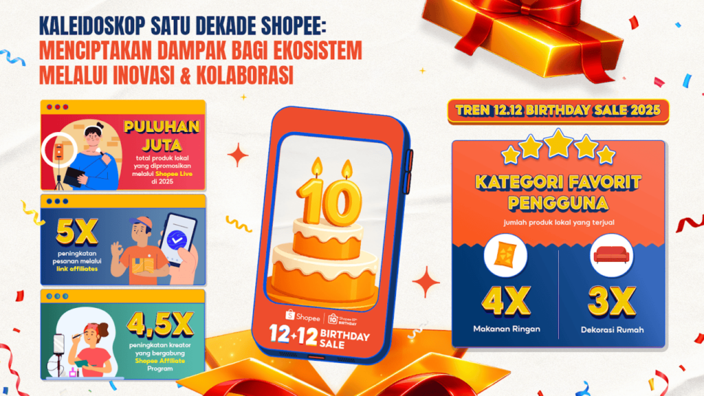 Memasuki usia ke-10 tahun, Shopee melihat partisipasi brand lokal & UMKM dalam memanfaatkan program maupun fitur interaktif semakin meningkat. Sepanjang 2025, brand lokal & UMKM menggunakan Shopee Live untuk mempromosikan puluhan juta produk lokal.