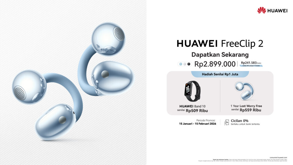 Selama periode first sale pada 15 Januari – 15 Februari 2026, setiap pembelian HUAWEI FreeClip 2 akan disertai dengan benefit tambahan berupa HUAWEI Band 10 senilai Rp 509.000 dan HUAWEI Loss Care senilai Rp 559.000.