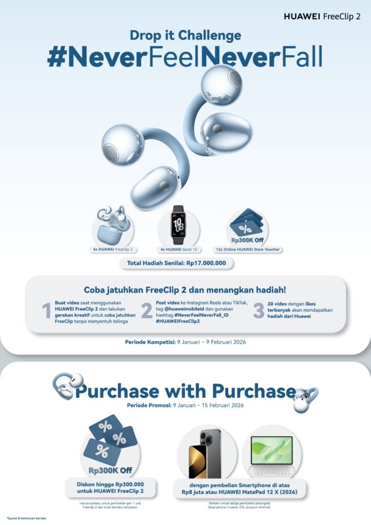 Dengan harga Rp 2.899.000, HUAWEI FreeClip 2 bukan cuma nyaman dan stylish, tapi juga bisa bikin kamu menangin hadiah keren lewat #NeverFeelNeverFall Challenge. Kesempatan ini terbuka sampai 9 Februari 2026.