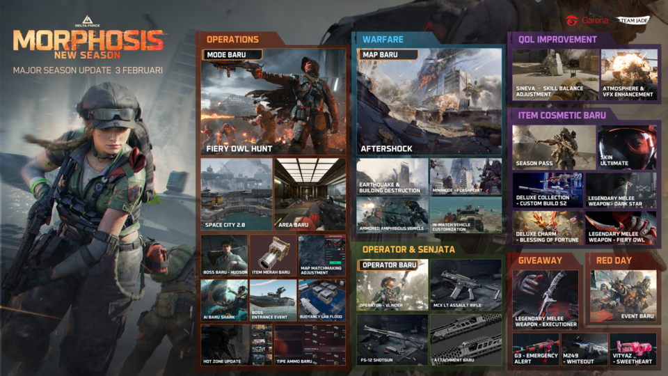 NATIVZEN.com – Garena® Delta Force resmi menghadirkan pembaruan pertamanya di tahun 2026 melalui Season Morphosis yang akan hadir mulai 3 Februari 2026. Pembaruan besar ini akan menghadirkan sejumlah pengalaman baru bagi pemain mulai dari hadirnya Map Warfare, Operator Support, dan Mode Gameplay Baru.