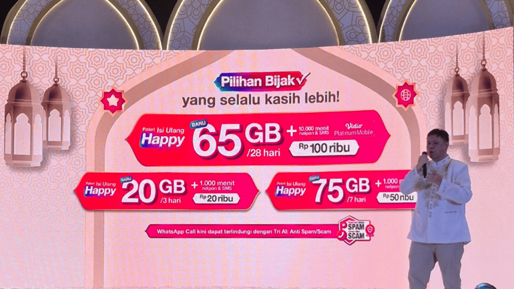 Salah satu penawaran unggulan Tri di Ramadan 2026 adalah Paket Isi Ulang Happy 65GB dengan masa aktif 28 hari seharga Rp 100.000. Paket ini dilengkapi dengan beragam ekstra benefit yang relevan dengan kebutuhan anak muda.
